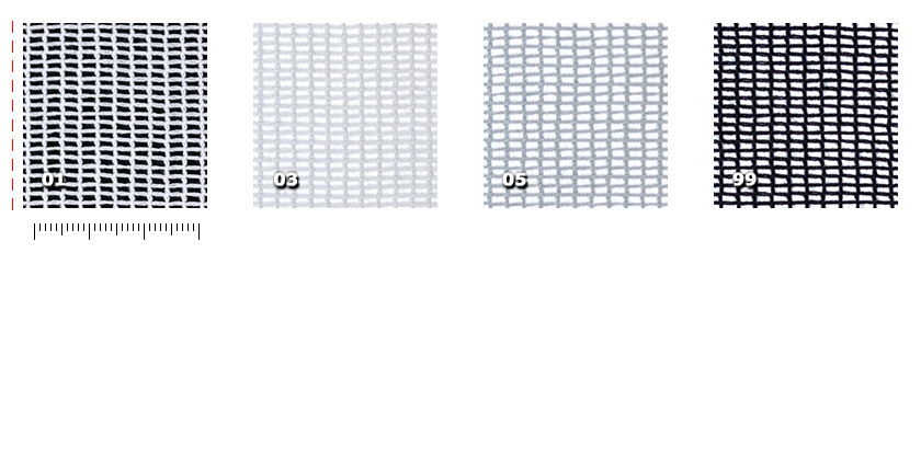 BSU - Super Gobelin 01. blanco03. gris05. holo grey99. negro La línea roja rasgueada identifica la posición del orillo con respecto de la malla.