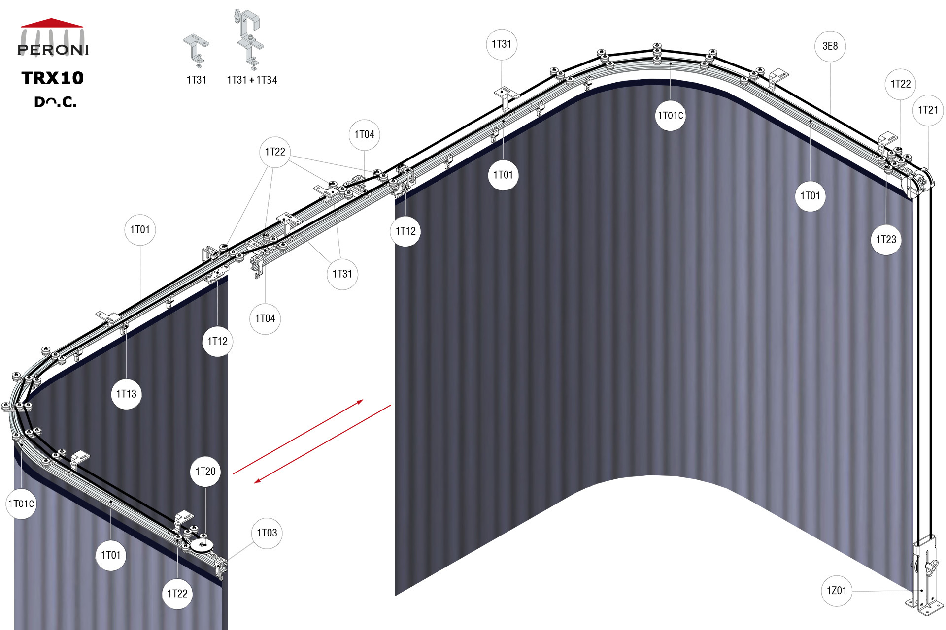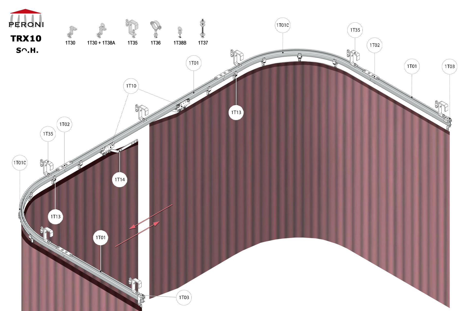 TRX - Sistema de carril Para:- Telones en americana de apertura central y lateral- cicloramas- Bastidores y Trastos leggeri