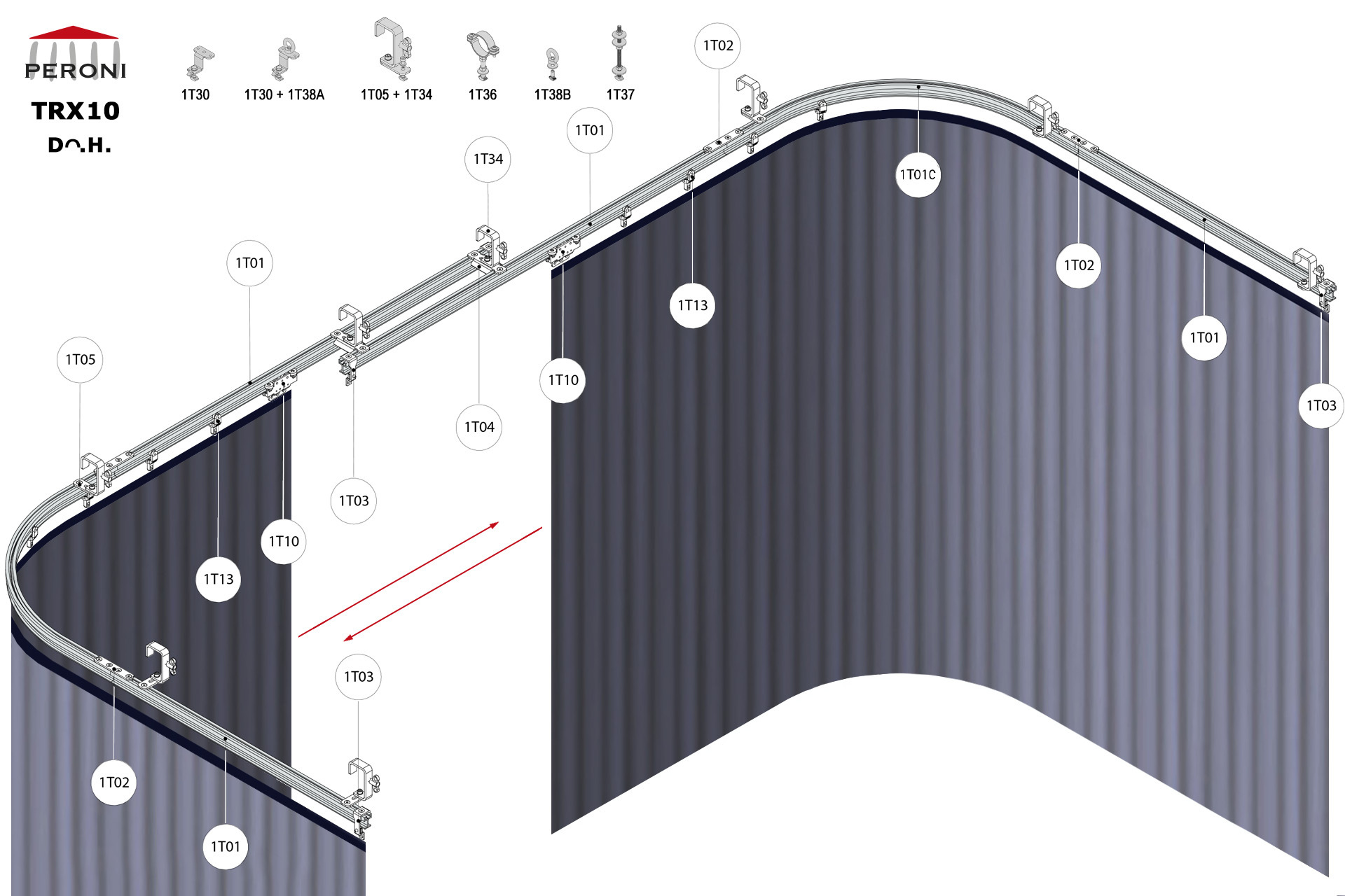 Carril configuración Dᴖ.H. Dᴖ. Apertura central riel doble curvadoH. Manual sin cuerdasuperposición central superior a 50 cmComponentes1T01 - Riel recto1T01C - Riel curvado1T02 - Unión1T03 - Tope1T04 - Placa distanciadora1T10 - Carro de cabeza1T13 - Carro 2 ruedas