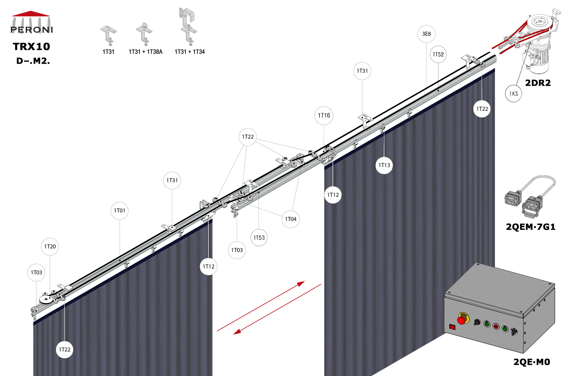 Carril configuración Dᴖ.M2. Dᴖ. Apertura central riel doble rectoM2. Motorizada, telón hasta 100 kgsuperposición central superior a 50 cmComponentes1T01 - Riel recto1T01C - Riel curvado1T02 - Unión1T03 - Tope1KS - Tope1T04 - Placa distanciadora1T12 - Carro de cabeza - Cuerda central1T13 - Carro 2 ruedasControl movimiento1T20 - Polea de reenvío1T22 - Guía - Cuerda central1T23 - Alineador - Cuerda central1T16 - Patìn final carrera - Cuerda central1T52 - Final carrera polea - Cuerda ctrl.1T53 - Final carrera - Cuerda central2DR2-RDS2QEM-7G1-152QEW-QEW3E - Cuerda Poly Ø 8 mm