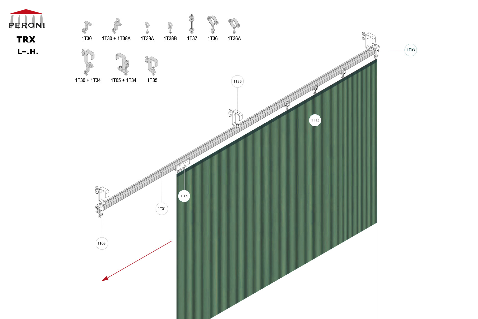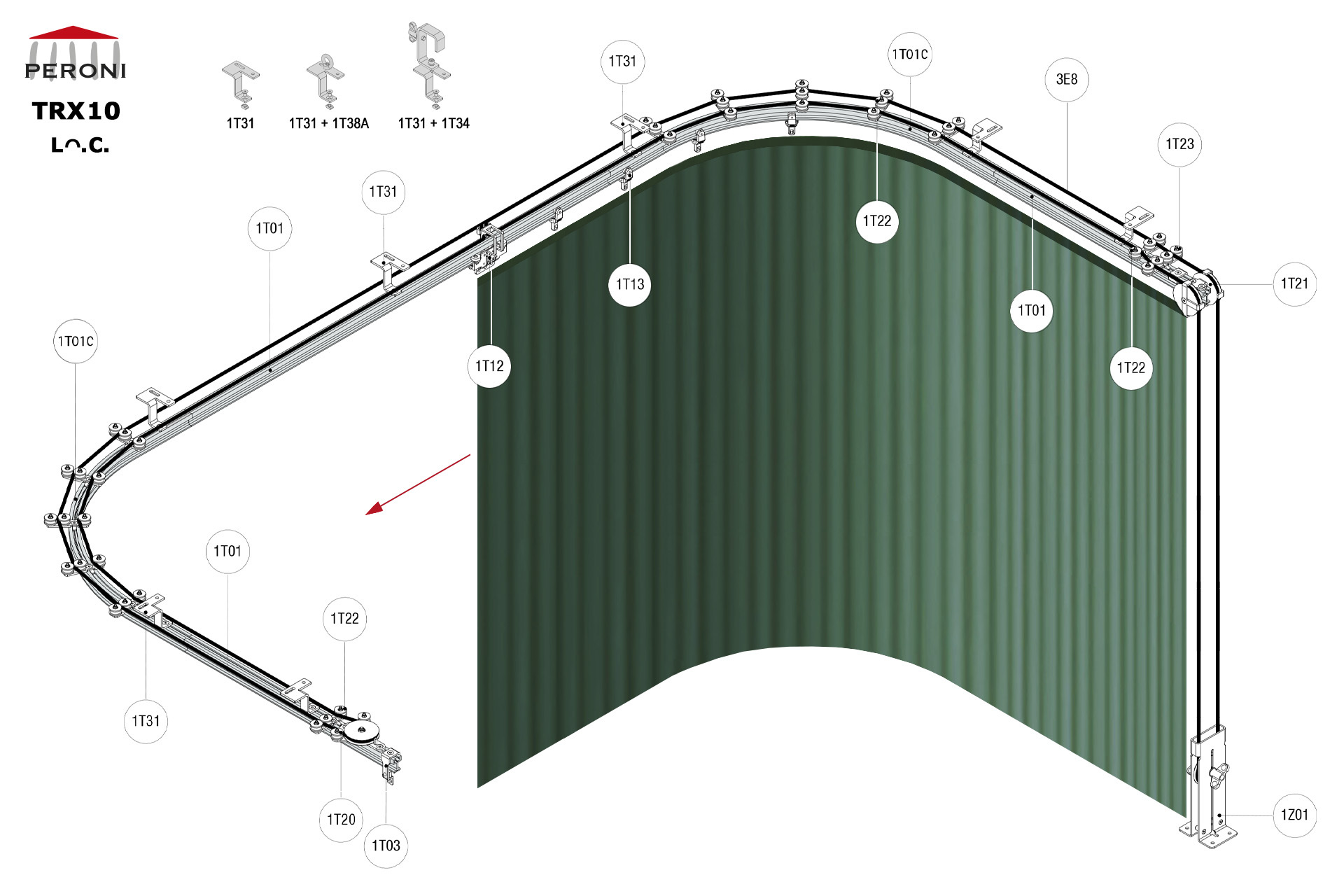 Carril configuración Lᴖ.H. Lᴖ. Apertura lateral riel curvadoH. Manual sin cuerdaComponentes1T01 - Riel recto1T01C - Riel curvado1T02 - Unión1T03 - Tope1T10 - Carro de cabeza1T13 - Carro 2 ruedas