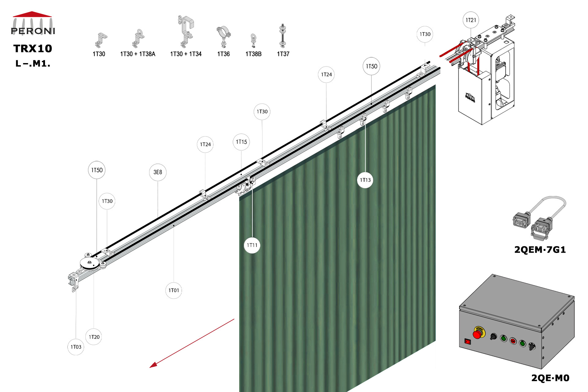 Carril configuración L–.M1. L–. Apertura lateral riel rectoM1. MotorizadaComponentes1T01 - Riel recto1T02 - Unión1T03 - Tope1T11 - Carro de cabeza - Cuerda lateral1T13 - Carro 2 ruedasControl movimiento1T20 - Polea horizontal1T21 - Polea doble1T24 - Soporte cuerda lateral1T15 - Patìn final carrera - Cuerda lateral1T50 - Final de carrera - Cuerda lateral2DR1-RDS2QEM-7G1-152QEW-QEW3E - Cuerda Poly Ø 8 mm