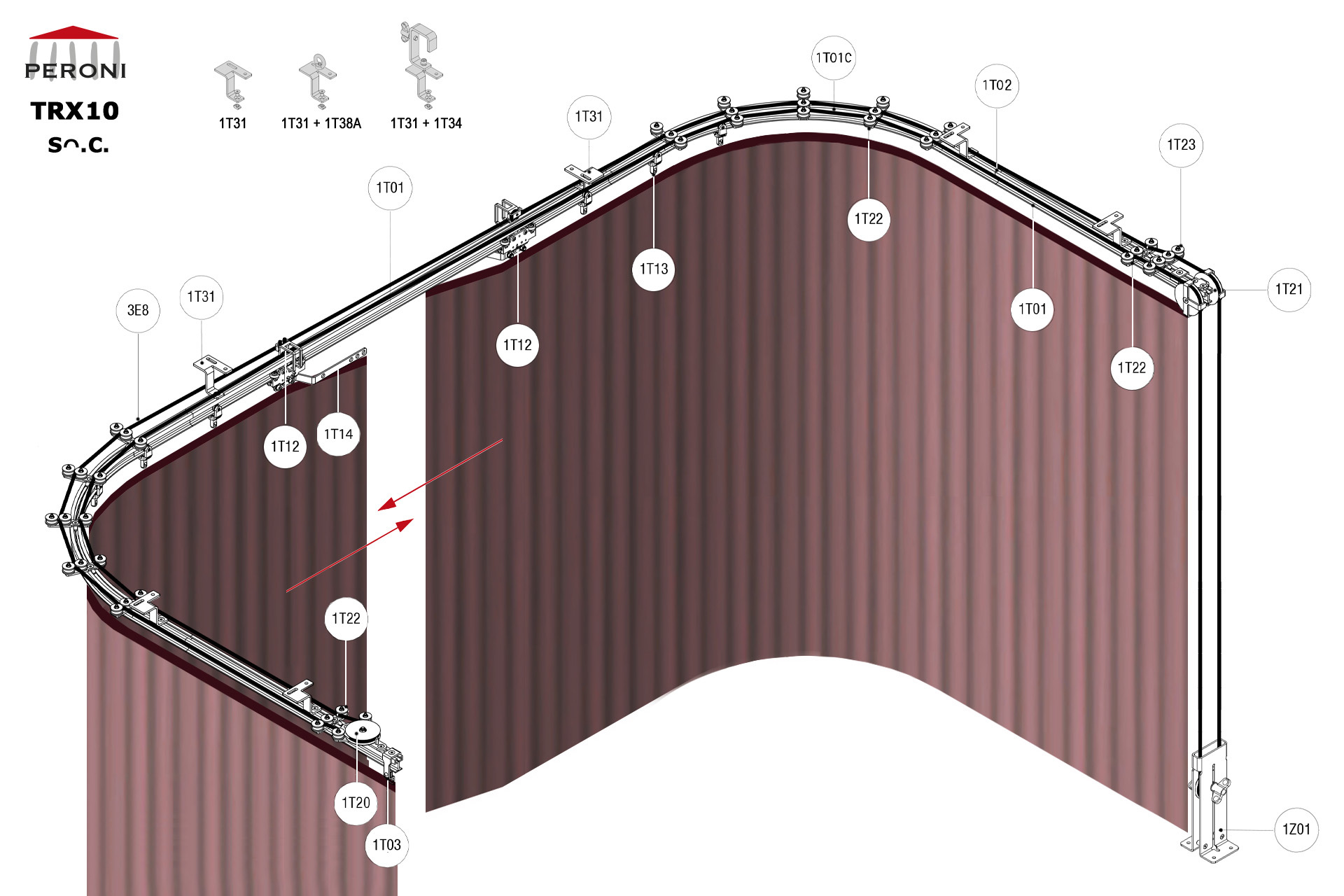 Carril configuración Lᴖ.C. Lᴖ. Apertura lateral riel curvadoC. Manual con cuerdaComponentes1T01 - Riel recto1T01C - Riel curvado1T02 - Unión1T03 - Tope1T12 - Carro de cabeza - Cuerda central1T13 - Carro 2 ruedasControl movimiento1T20 - Polea de reenvío1T21 - Polea doble de cabeza1T22 - Guía - Cuerda central1T23 - Alineador - Cuerda central1Z01 - Ver todas las opciones3E - Cuerda Poly Ø 8 mm