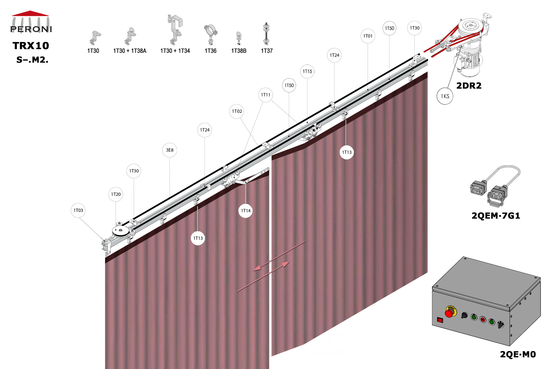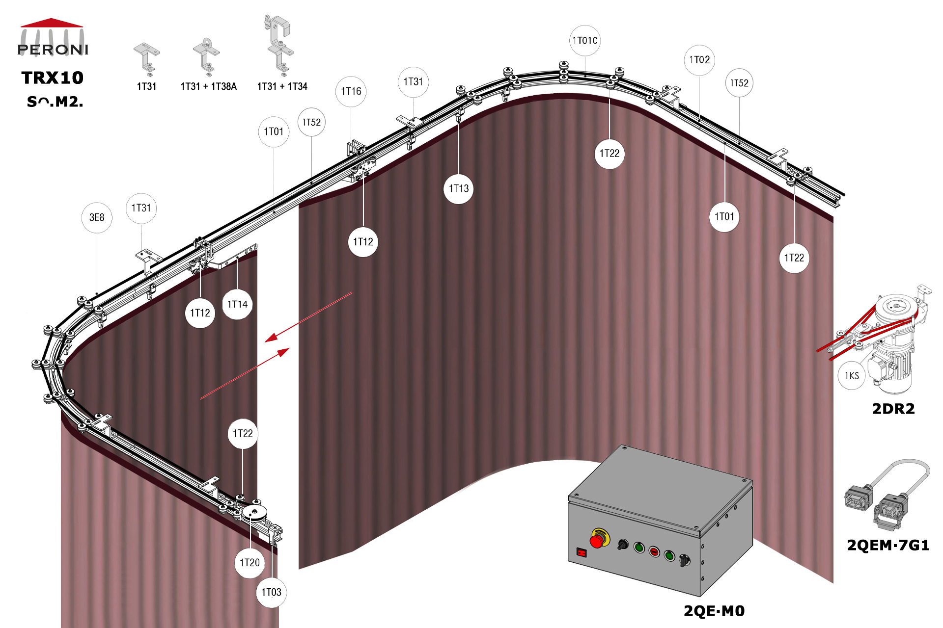 Carril configuración Sᴖ.M2. Sᴖ. Apertura central riel único curvadoM2. Motorizada, telón hasta 100 kgsuperposición central hasta 50 cmComponentes1T01 - Riel recto1T01C - Riel curvado1T02 - Unión1T03 - Tope1KS - Tope1T12 - Carro de cabeza - Cuerda central1T13 - Carro 2 ruedas1T14 - Pletina de superoControl movimiento1T20 - Polea de reenvío1T22 - Guía - Cuerda central1T23 - Alineador - Cuerda central1T16 - Patìn final carrera - Cuerda central1T52 - Final carrera polea - Cuerda ctrl.2DR2-RDS2QEM-7G1-152QEW-QEW3E - Cuerda Poly Ø 8 mm