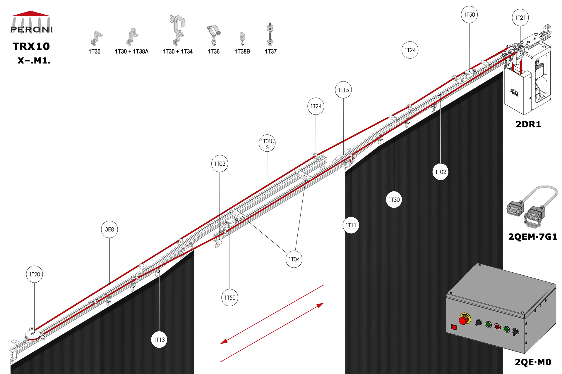 Carril configuración X–.M1. X–. Apertura central riel único separado rectoM1. Motorizada, telón hasta 300 kgsuperposición central hasta 100 cmComponentes1T01 - Riel recto1T01C-S - Riel curvado para separación1T02 - Unión1T03 - Tope1T04 - Placa distanciadora1T11 - Carro de cabeza - Cuerda lateral1T13 - Carro 2 ruedasControl movimiento1T20 - Polea de reenvío1T21 - Polea doble de cabeza1T24 - Soporte - Cuerda lateral1T15 - Patìn final carrera - Cuerda lateral1T50 - Final de carrera - Cuerda lateral2DR1-RDS2QEM-7G1-152QEW-QEW3E - Cuerda Poly Ø 8 mm