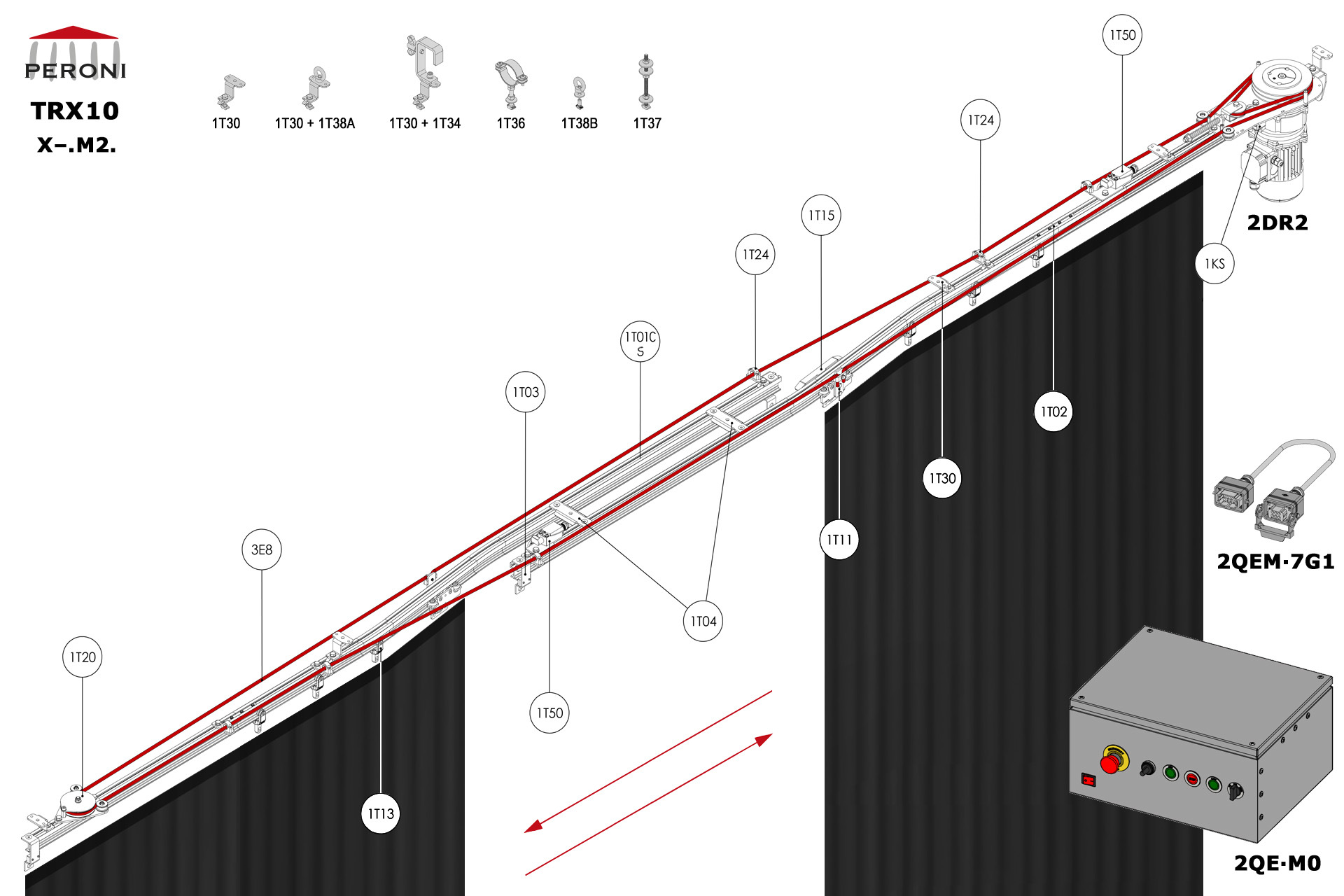 Carril configuración L–.M2. L–. Apertura lateral riel rectoM2. Motorizada, telón hasta 125 kgComponentes1T01 - Riel recto1T02 - Unión1T03 - Tope1KS - Tope1T11 - Carro de cabeza - Cuerda lateral1T13 - Carro 2 ruedasControl movimiento1T20 - Polea horizontal1T24 - Soporte cuerda lateral1T15 - Patìn final carrera - Cuerda lateral1T50 - Final de carrera - Cuerda lateral2DR2-RDS2QEM-7G1-152QEW - Cuadro eléctrico W 3E - Cuerda Poly Ø 8 mm