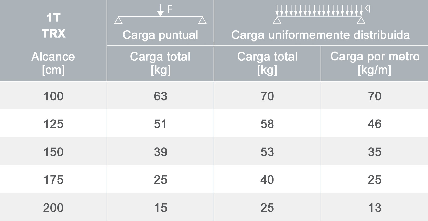 La tabla muestra las cargas máximas aplicables solo al riel.