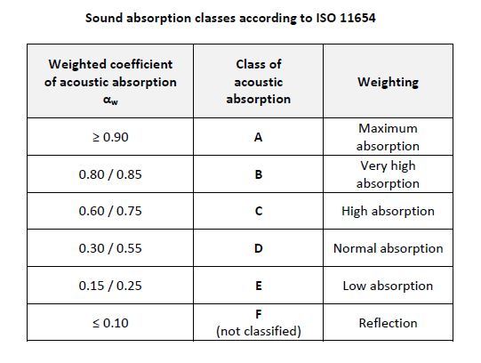 Classes d'absorption acoustique selon ISO 11654 L = basses fréquencesM = fréquences moyennesA = hautes fréquencesαp = coefficient d'absorption acoustique pratiqueαs = coefficient d'absorption acoustique par rapport à la fréquenceDans le cas de l'exemple, le coefficient d'absorption acoustique pondéré αw = 0.70 ( MH ) indique que le matériau atteint l'efficacité maximale dans les fréquences moyennes et hautes.