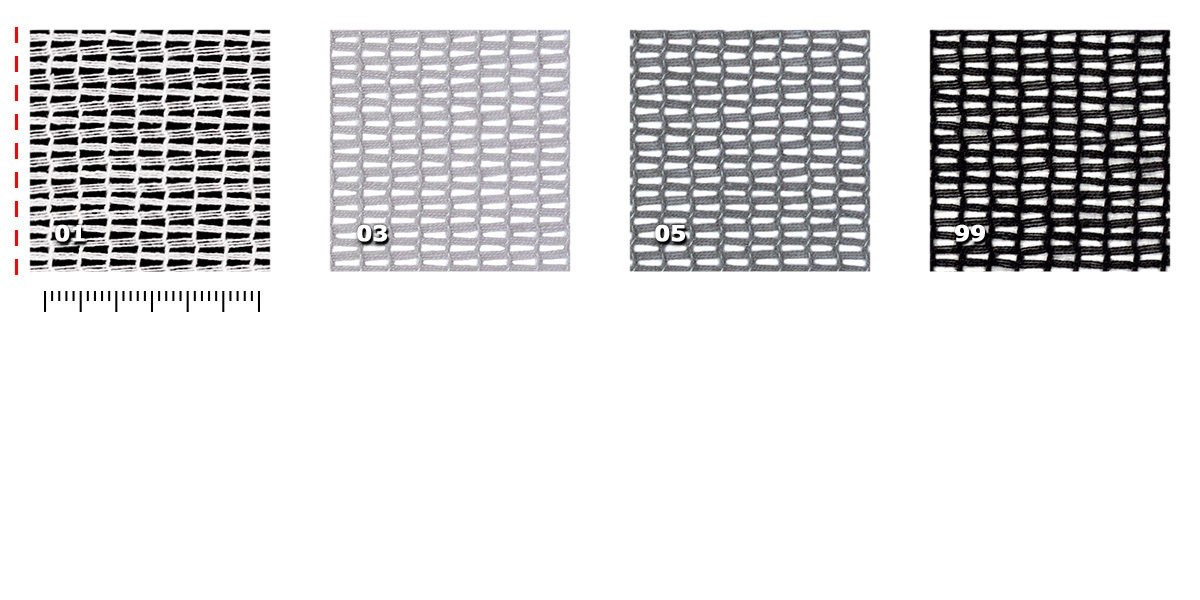 BGO - Gobelin 01. branco03. cinza05. holo grey99. pretoA linha vermelha pontilhada identifica a posição da ourela em relação à malha.
