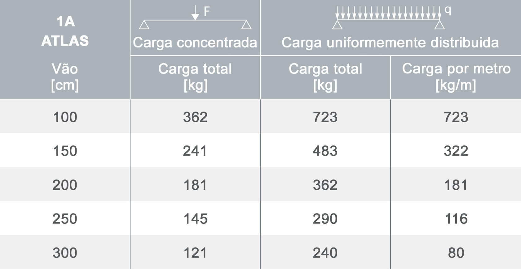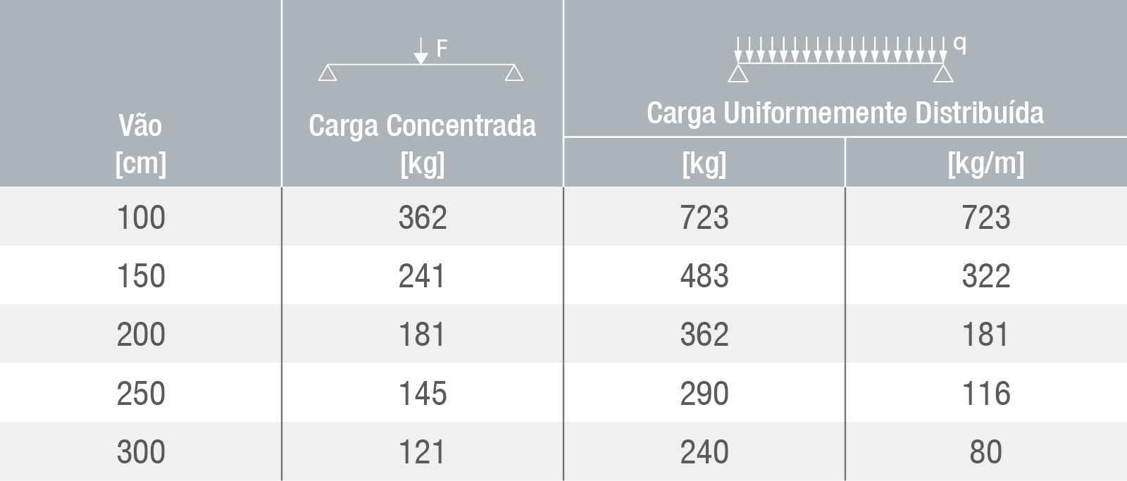 A tabela mostra as cargas máximas aplicáveis apenas ao trilho.