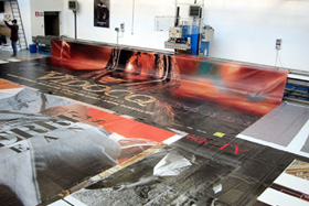 The sewing and welding departments assemble the printed sheets, to make up backdrops that often reach gigantic proportions.