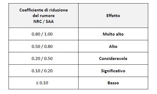 Coefficiente di riduzione del rumore NRC (Noise Reduction Coefficient) È compreso tra 0.00 e 1.00 e indica l'assorbimento acustico medio di un materiale.